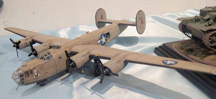 ハセガワの1/72B-24D。タイダルウェーブ作戦にてプロイェシュティ油田を爆撃した当時の塗装になっている。主翼の幅が長すぎて全体を写しきれなかった(泣)。