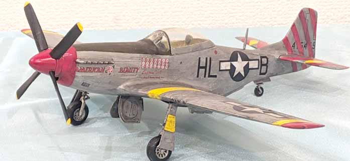 写真のオオタキ1/48のP-51Dは地中海戦線のトップエース、John J. Voll大尉が搭乗した308FS/31FGの「American Beauty」で、尾部の塗装はデカールを使わずに塗装仕上げとした。この戦線のマスタングは赤や黄など彩色度の高い色使いが多くてかなり派手な見た目になるのでかなり目立つ。