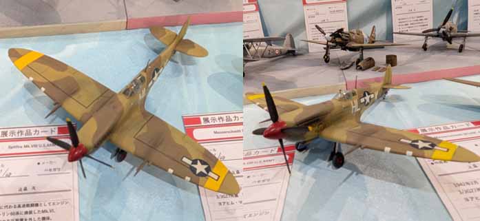 Bf109のライバル、ハセガワ1/48スピットファイアMk8。これまた「逆レンドリース」の機体と思われるが、この時すでに後のP-51にみられる黄色い翼のストライプが塗られていたとは!