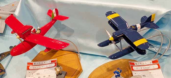 今回のテーマで架空であっても欠かせないであろうテーマである宮崎駿監督の「紅の豚」のサボイアとカーチス(ファインモールド1/48)。大戦間の飛行機であっても張り線はいらないのだろうか?だったらパパっと作ってコレクションにしようか、、、