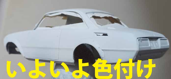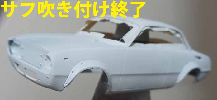 ハセガワベレットGT-Rのボディを改修し塗装の準備を万端に整えたちゃーべんは、まずサーフェイサーの下塗りを始めた。サーフェイサーの段階では最終的にボディを真っ白にする予定ではあるが、最初の「捨て塗り」を含めて5回以上塗膜を重ねた。成形色も濃い緑色なので、今回はよりかけ離れた色にする予定なので真っ白にする必要がある。そして白く染めた上でまずこの段階から平滑な塗膜を作るべく研ぎ出しを行っておく、、