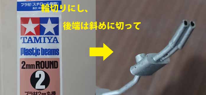 またマフラーも市販仕様の物を使う予定であるが、よくよく説明書を見るとマフラーのリアエンドの部品が無いのである!まさか市販車ベースのチューニングカーとはいえGTRの心臓、G161Wエンジンの直管サウンドはいくら何でもけたたましかろうと思うので、タミヤの直径2mmの丸プラ棒でエンドを作る。マフラーに取り付ける部分は輪切りにし、後端は斜めに切って浅く孔を開ける。孔の奥を黒く塗って管を表現するので貫通させる必要は無い。強度を求められる個所ではないので角度に気を使いながら取り付ける。これは上にハネるように取り付けた方がカッコいいかもしれない。
