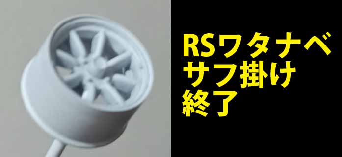 今回のワタナベホイールは以前のダルマセリカやハコスカと打って変わって銀色にする事にした。というのは今回の窓枠は黒にする予定なので、あまりにも黒い部分が多くなりクドくなってしまうと思ったからである。まずはホイールに嵌ったタイヤを取り、ランナーからもホイールを取り出す。爪楊枝を挿して表裏を一編にエアブラシ掛け出来るようにし、これもまた5回以上の塗膜を重ねていく。サーフェイサーでマッシロケにして銀を塗装し、センターキャップの上のみ黒塗装をしてメリハリをつけるつもりである。