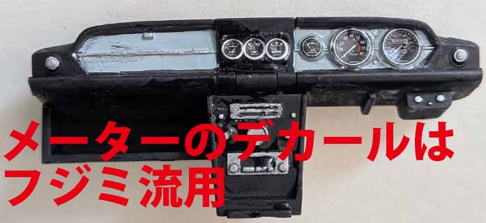 ハセガワベレットGT-Rの内外装部品を後はクリアー掛けすればOK、という所まであともう少しのちゃーべんは、またインパネで失態をしてしまった。プラ板に貼って後はインパネに小部品を嵌め込むがごとくメーター類を完成させようとしたが、メータの種類が使用予定のインパネと違っていたのである!しかしながら確認を怠った事に後悔する事も無くストックしてあるフジミのベレットGT-Rから計器類のデカールをそのまま流用しようと決めた。念の為サイズを確かめたら破綻が無い事が判り、早速流用して事無きを得た。フジミにまた請求するか…。