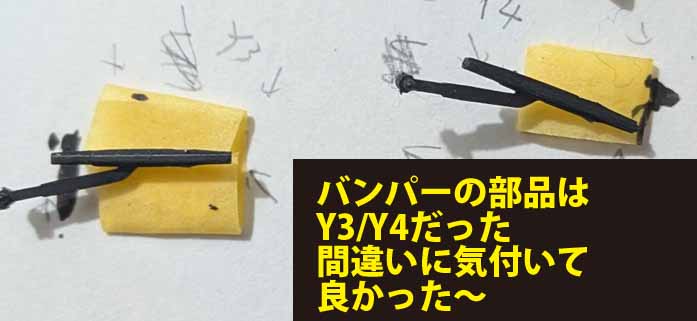 ボディ以外は即クリアー掛け、という段に来て、事もあろうにというかやはりというべきか、ワイパーの部品が純正ではなかったという事に気が付いた(説明書ではY3、Y4)。完成間近のタイミングでないだけ良かったというべきか。ここまで来たらもはやルーティンとなった感のあるタマリの切り離しも速攻で済ませ、黒く塗って準備完了と相成った。ベレットの純正ワイパーと形が似ているので何の考えも無く準備を進めてしまったのがいけなかったのだろうか?取り敢えず事前に見つかって胸を撫で下ろしたが、組立説明書をよく読まないちゃーべんにも我ながら困ったものである、、、