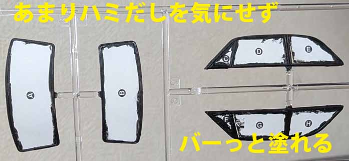 マスキングの終了した窓パーツを黒く塗装していく。何分専用マスキンググッズのお陰で黒がハミ出る事をそんなに心配する事無く塗り進めることが可能なのが心理的ハードルを下げてくれているかの様だ。三角窓の角度もまたハコスカに似た感じでベレットの丸っこいボディにシュッとしたアクセントを加えている。ボディの色が濃い場合は銀色にしてアクセントにする必要があるが、今回はボディ色が明るいので黒くする。そういえばハコスカHTの窓枠の内側も黒くなっていたので、似たような雰囲気が出せるのだろうか?