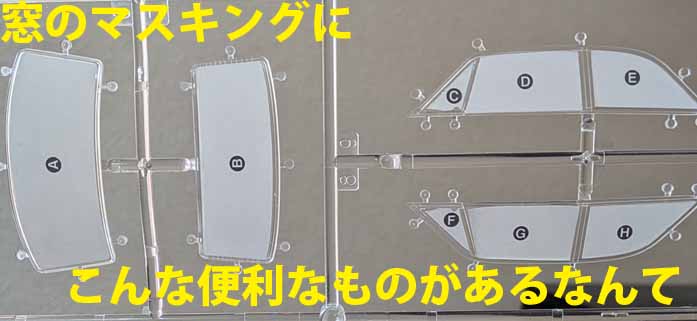 今までハセガワベレットGT-Rを組み立てていて半分以上はタマリの処理という記憶のちゃーべんであったが、嬉しい気遣いを感じさせるアイテムがあった!窓枠のマスキングなんてクルマのプラモを作っていて初めてのアイテムである。他のクルマのキットはボディ色に塗った後に長さを調節してカットしたマスキングテープでしっかりマスキングして塗装する必要があったが、こちらは寸分違わずカットされたテープを貼って窓枠の色に塗装すればいいのである。色がガラス面にハミ出す心配がなくなったというのが嬉しい。今回は明るいボディ色に凄味をプラスして黒くしようか、、、