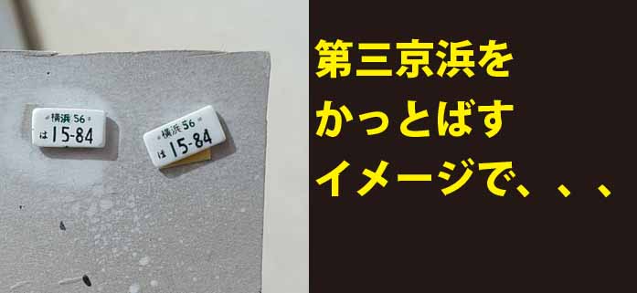 そしてちゃーべんはナンバープレートの材料であるプラ板を7mm×14mmに切り出して、表面のペーパー掛けを400→600→1000→1500→2000番の順で行い、塗料の食い付きを向上させる。お次に塗装は裏側を真っ白に塗り、乾いたら反対側も、という所だがナンバーはどこにしようかまだ決めていなかった!そこでやはり国内で有名な走りのステージに近いご当地ナンバーをという所で横浜ナンバーにしてみた。有名な第三京浜を飛ばしているイメージが否が応でも膨らむというものである。オーバーフェンダーも厳ついベレGが第三京浜を疾走する…そんなイメージを頭に浮かべながら製作を続けよう。