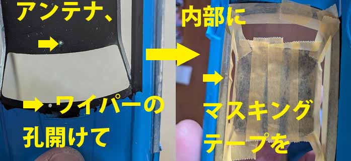 ボディの塗装はあとはクリアー掛けの上研ぎだして1週間かけて乾燥させて完成という所だが、その前にボディ内側のマスキングテープを貼り換えなくてはならない。サーフェイサーから厚塗りしたクリアーの塗膜に覆われたマスキングテープを剥がすのは塗膜を「持っていかれる」ようにボディの成形色の地肌が露出する恐れがあるので、まだ取り返しのつくこの段階で貼り換えるのである。そしてこの段階で屋根上のアンテナの取付孔とワイパーの孔を開ける。ここまで手を付けていなかったのは最悪の場合ボディカラーが内部まで吹き込むのを避けるためで、なるべく色が内部に吹き込んでカオスにならない様にと考えた末の判断であるがウッカリするとクリアー掛けが終わった時に気付いていた、なんて事になりかねない、、、