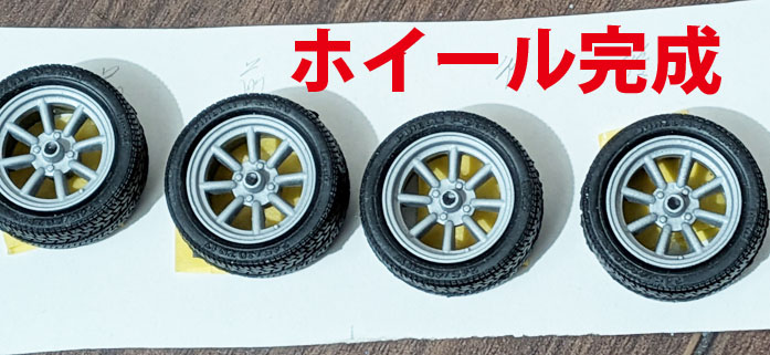 ちゃーべんが出来る限り丹念にクリアー掛けを重ねて研ぎ出してまたクリアーを重ね、全塗装工程を終えたボディは1週間ほどホコリを避けて乾燥させる。しばしの別れにちゃーべんもちょっと切なくなるが、この後に灯火類やボンネットの組み立ての工程が待っている。他のメーカーのパーツ割であったらもっと大まかになってるところをわざわざ実物よろしくパーツ割しているので1週間の間はこれらをじっくり組み立てよう。またベレットのカッコイイボディがしばらく見れなくなる寂しさも、これまた丹念に塗装を施したフジミのRSワタナベホイールの完成を見たことで吹き飛んでしまった。装着したらどんな雰囲気だろう、ワクワクが止まらない、、、、、、