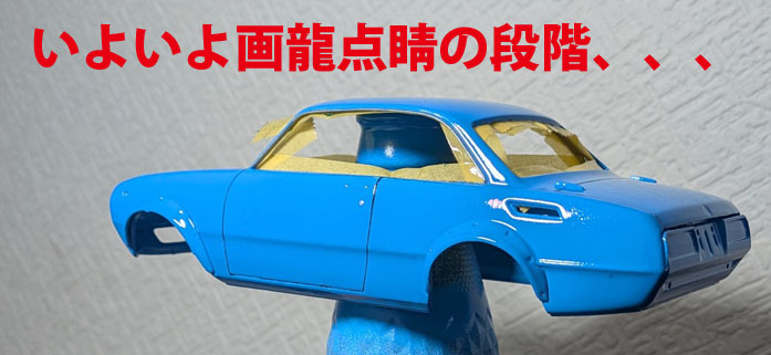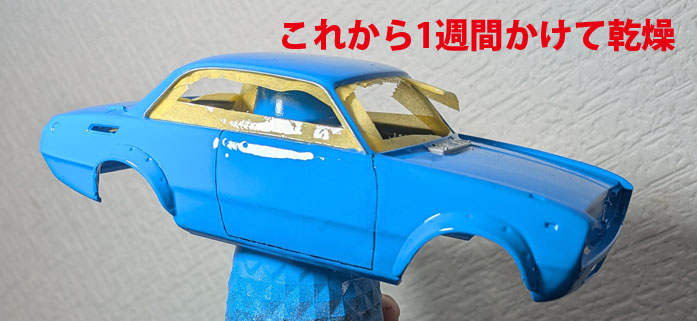 ボディも愈々画竜点睛の段階、クレオス#46クリアー掛けを開始するが、その前に内側のマスキングテープを貼り換えておく。サーフェイサーから厚塗りしたクリアーの塗膜に覆われたマスキングテープを剥がすのは塗膜を「持っていかれる」ようにボディの成形色の地肌が露出する恐れがあるので、まだ取り返しのつくこの段階で貼り換えるのである。クリアー吹き付けの最初のうちは少しずつクリアー層を重ねる「捨て塗り」になるが、塗膜が平滑でないのはこの時点ではあまり気にしなくてもいい。それよりも気を付ける必要があるのはホコリで、クリアーの塗膜の薄いうちから一回全体にクリアー掛けして乾燥後にヤスリで研ぎ出して除去する必要がある。それでクリアーの層を重ねる前にエアダスターでホコリを飛ばす必要があるが、それでもホコリを巻き込んでしまう事はしょっちゅうなので、今回も注意を怠らずにクリアー掛けを進める。