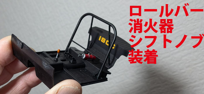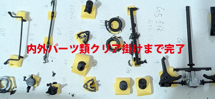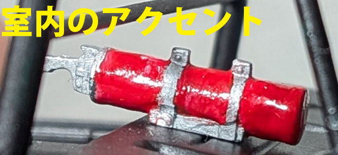 今回のクリアー掛けで気を付けねばならないのは内装部品でクレオス#46クリアーを塗装する部品がある事で、内装部品でアクセントとなる消火器である。窓の向こうからでも存在感を引き立たせる為にはツヤがあった方がいいと思った。まるでハコスカやケンメリのGT-Rの様に内装が黒一辺倒でもシブい事はシブいのだが何かアクセントが必要かもと考えて公道の走り屋仕様でも消火器は常備しているクルマもある事だし、折角手に届く所にセットするのだから後もう一つアクセントを付けられないかという事がツヤのあるクリアーにしたことの理由であるが、実際装着してコクピットの仕上がりはどうなるか?完成したらどんな雰囲気になるのかと今から楽しみである。