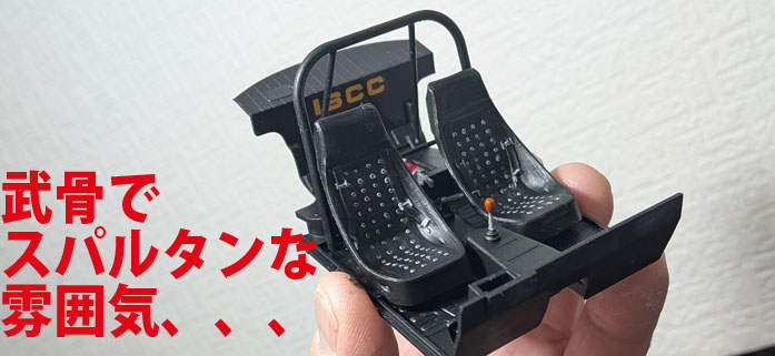 そこでいよいよ組立を内装から始める。まずは組みやすい順にシフトレバーと消火器を組む。黒づくめの室内でウッドのシフトレバーはいかにも市販車から改造された個体という雰囲気がして面白いと思う。また消火器も本気度がうかがえるようだ。単なる凄味やハッタリではない迫力が感じられる。その次にロールバーとバケットシートを装着するが、これまたスパルタンさがタマラナイ。AMT1/25の’66フォードマスタングのヘッドレストの無いバケットシートがまた懐かしさと武骨さをプラスしている。念のため申し上げておくがここでペダル類の部品の接着もお忘れなく…。