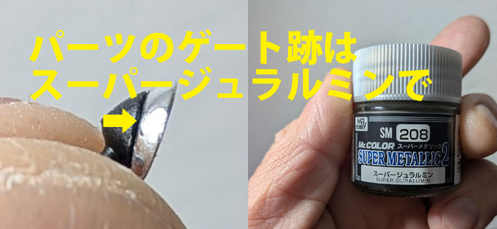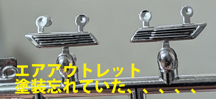 前回で塗装は終了、と言っていたちゃーべんであったがこの後部エアアウトレットのスリット(J6/7)をすっかり塗り忘れていたことに気が付いた。爪楊枝を削って先鋭化した先端につや消しブラックを付けてスリットをなぞる。作業にして数分だが出来る直前に気付くといった事態は回避できて良かった。そんな状況になったら完成間近という状況でテンションに冷や水を浴びせかけられた気分になってしまう。幸いパーツのモールドのキレの良さにも助けられてスイスイ終わらせる事が出来たが、これまで手を付けていなかったパーツは無かったかまたちゃーべん自身に対して疑心暗鬼になってしまった。そろそろ製作も終盤になってきたので必要なメッキパーツを切り出して接着部のメッキを削り落しておかねばなるまい…。