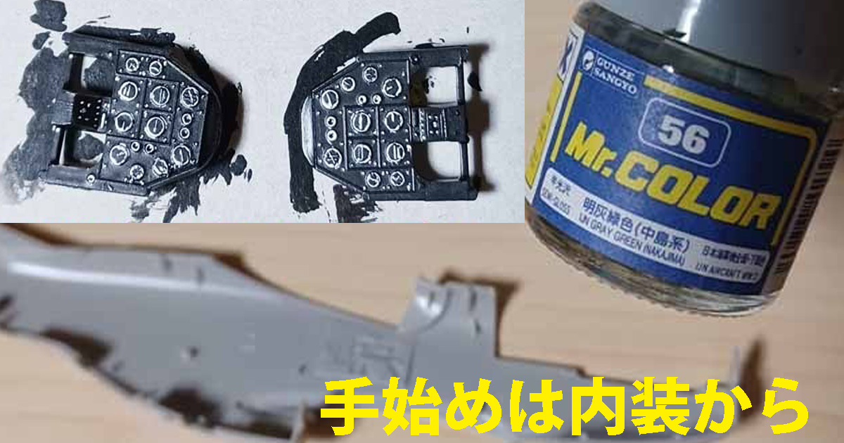 そして組み立てる前に確認して良かったと思ったのが主脚を収めるところの部品が翼上面に干渉して翼の上下が接着出来ないという情報である。旧オオタキの零戦や隼のそれを見慣れた目にはかなり深く見えたので念の為仮組みしてみたら何のことはなくスンナリ組めた。こうしたところもさすが高年式のキットと脱帽。これにて懸念事項は解決と相成った。以上サムライの字に組む前に一通りの確認を終えたが、室内はで塗装の予定で、以前のフジミのマスタングの民間型と同じ色(クレオス#56明灰緑色(中島系))にする予定。今回は一人乗りの仕様でコクピットの中が大きく見える訳ではないので塗る面積はそれ程無い。キャノピー枠も今回は枠もシンプルな物なので塗装もマスキングも手間取らないだろう。ただクレオス#56の塗料が旧版の上がツマミが付いている物なのでまずはシンナーでの溶解待ちというちゃーべんであった。