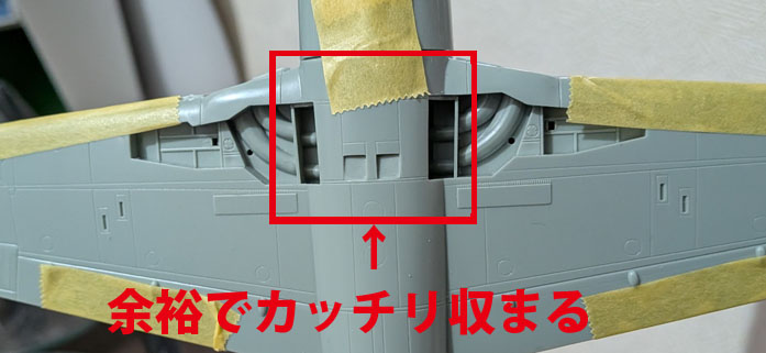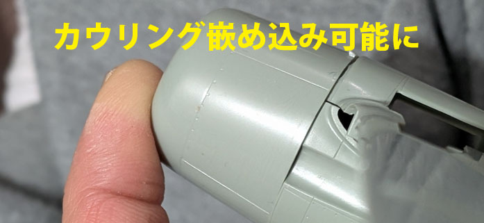 まず削って調整する必要があるのがカウリングと機体で、ここは機体側の内側にキックバックした所を削って微調整。下膨れの断面を確かめて上下間違いない様に仮組みする。R-2800のエンジンも相当な直径があるが判るがよく零戦よりも小さな機体に纏められたものだと改めてビックリの次第。カウリングの形状もギリギリに直径を詰められており、冷却がちゃんと出来たのかとすら思う程である。太くて逞しいが、アメリカ機の武骨さとはかけ離れた洗練度が判った様な気がした。