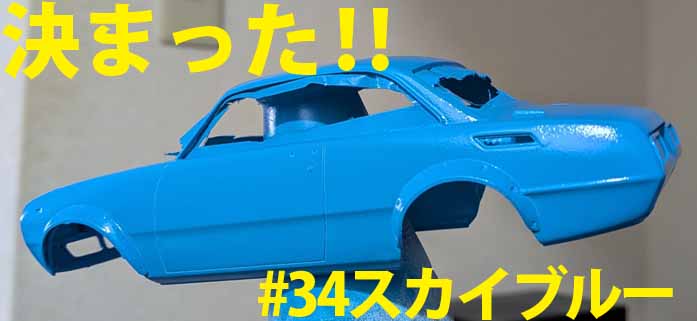 そして迷いに迷ったベレットベレットGT-Rのボディカラーであるが、クレオス#34スカイブルーにした。プロトタイプの「GTX」のイメージに近い(本来はもう少し薄い)色を、と思ってこの色に決めた。これぐらいクッキリした色ならば色々黒っぽい部分が目立つ塗装にしても映えるし、あまりケバくならずに明るい色調でまとめる事が出来ると思ったからである。本来ならばもう少しくすんだ色合いにする方が旧車らしいとも思ったのだが、今回もインパクト重視の雰囲気を出したいのでこれで決めた。派手目の塗装を楽しむのならばこのキットを複数台購入して楽しめばいいかとも言われそうだが、以前にも書いたように星の数ほどあったタマリを切り取るのはもうイイ、、、、